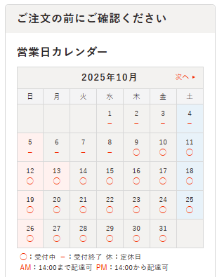 以降の店舗の受注状況によりましては突発的にご注文を締め切らせていただく場合もございます(締め切りの通知などは行っておりません)。